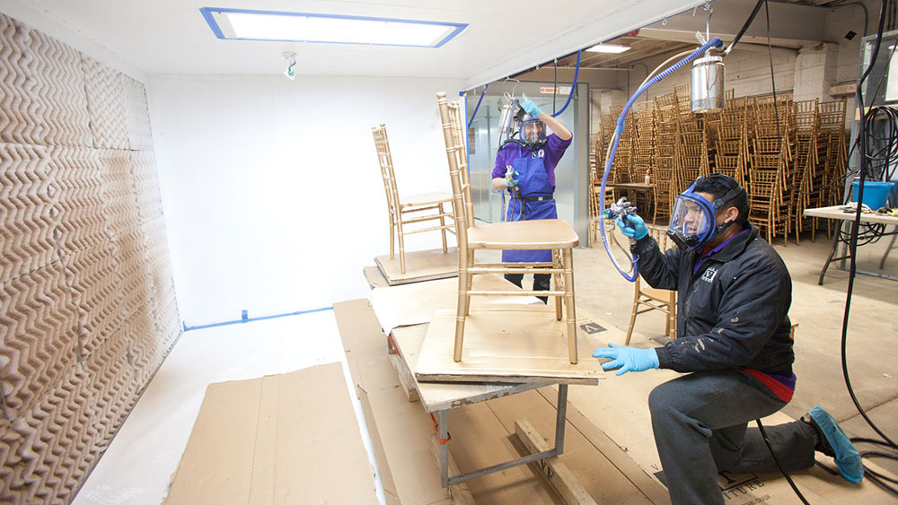 Painting in multiple colors — gold, mahogany, black, white, silver and more — Vision Furniture is currently working through thousands of chairs to bring them up to the high-quality standards that chiavari chair renters and owners have come to expect.