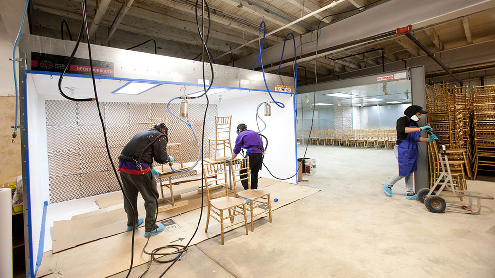 To keep their inventory of chiavari chairs in peak condition, Vision Furniture outfitted an empty workshop and storage area in its Philadelphia headquarters to create a 2,100-square-foot paint workshop to process, sand, paint and refinish chairs in one place. Completed in 2018, the new paint workshop features a 14-by-7-foot Open Face Paint Booth and a 20-by-7-foot Drying Room from Global Finishing Solutions (GFS).