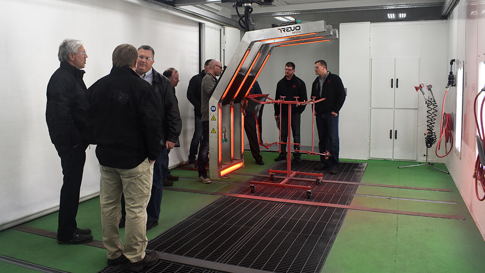 During their search, their paint vendor, Blue Rock, advised them to tour Global Finishing Solutions’ Center for Excellence training facility in Osseo, Wisconsin. The visit allowed them to meet with their local distributor, Chassis Liner Supply, and test out top-of-the-line automotive paint booths, as well as electric short wave infrared REVO Systems firsthand.