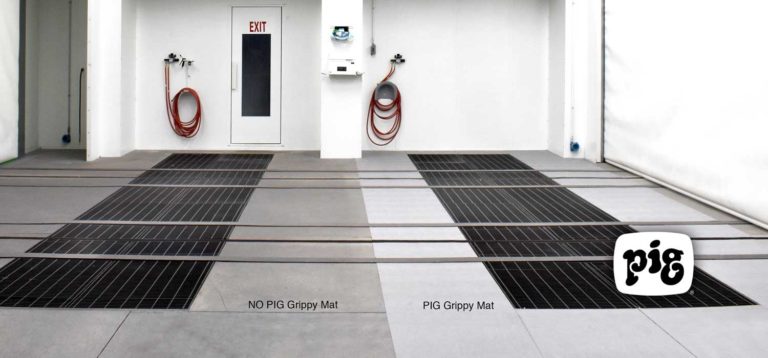 Depending on the amount of overspray and cleaning, the PIG Grippy Mat can last up to three months — durable enough to withstand foot and vehicle traffic. The padding on the PIG Grippy Mat reduces noise and makes standing and kneeling more comfortable, while its bright gray color helps to evenly distribute light and eliminates shadows and reflections on the paint job.