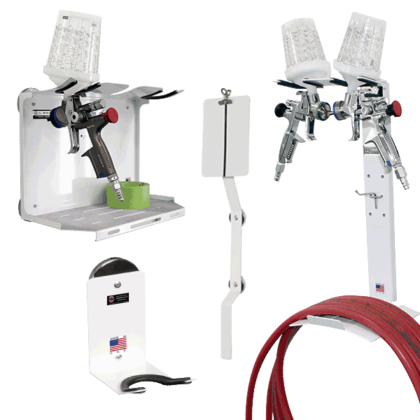 The Hose & GunHanger is a magnetic air hose hanger and double spray gun holder, designed for paint booths, prep areas or paint mix rooms. It comes equipped with a hook ā for storing tape, gloves, tack cloth or other commonly used supplies. With the Hose & GunHanger, you can spend more time working and less time worrying about clutter slowing down your operation.