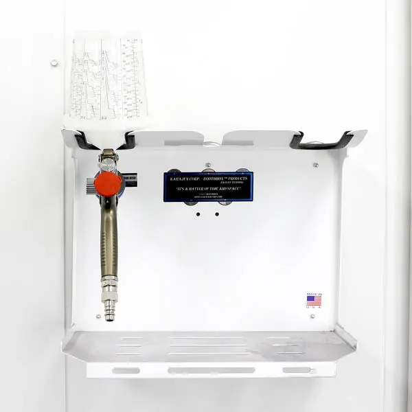 The Booth Shelf WM combines a magnetic, three-position spray gun holder with a vented storage shelf. It can be used in a paint booth, prep area or mix room to hold spray guns, tape, tack cloth and other supplies, so you can spend more time on repairs and less time trekking in and out of the booth. A strong magnet holds the Booth Shelf firmly in place, and it can be easily moved to a different location in your booth.