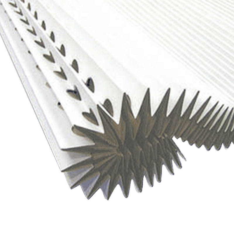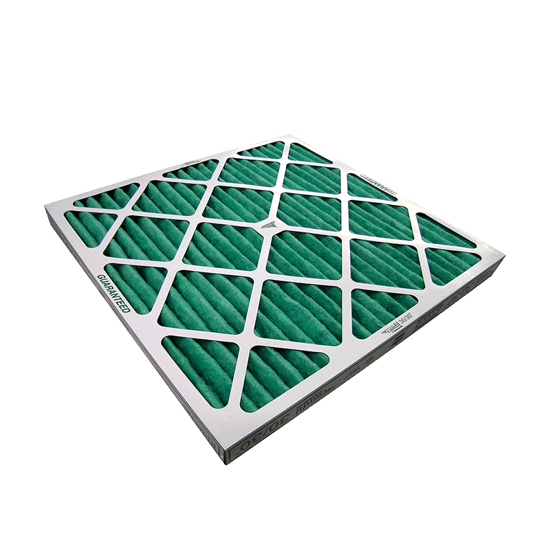 Pleated cardboard is an accordion-style, collapsible paper filter with round holes that traps overspray and reduces filter replacement cost. Overspray-laden air is drawn into the filter by the booth’s fan and makes several radical directional changes as it’s forced through the trapping chambers of the filter. Kinetic energy generated by each change in air direction causes individual paint particles to be deposited on the surfaces within the filter.